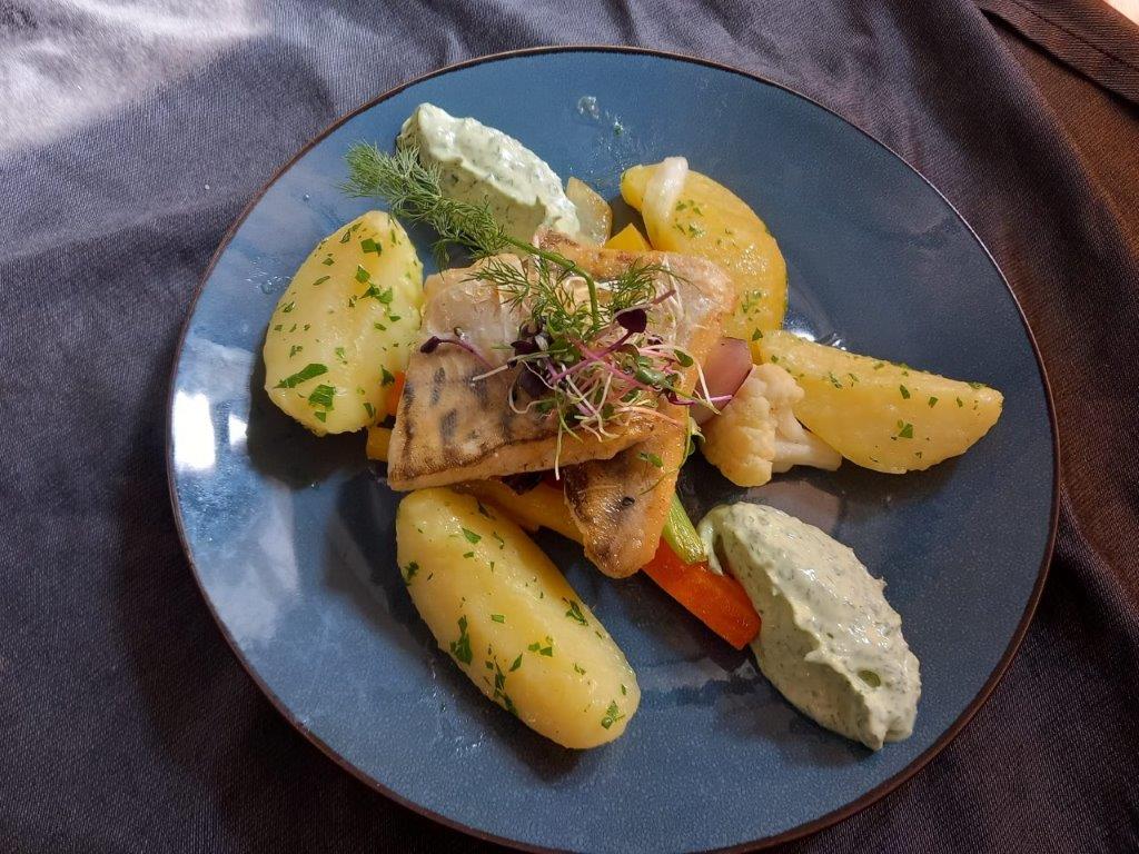 mit frischen Kräutern in der Pfanne gebraten, dazu Butterkartoffeln & einen kleinen Salat