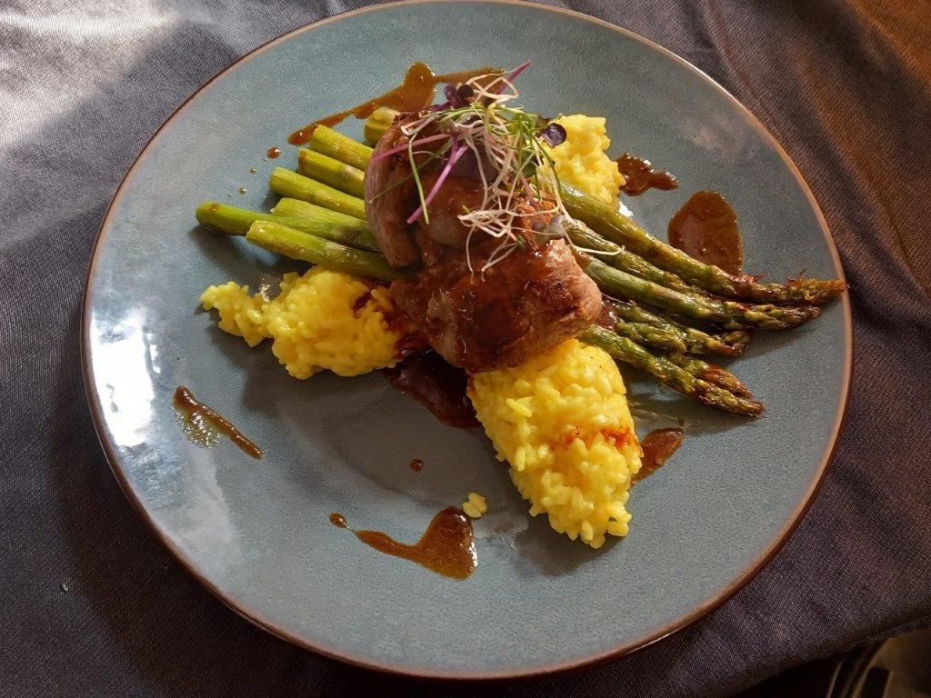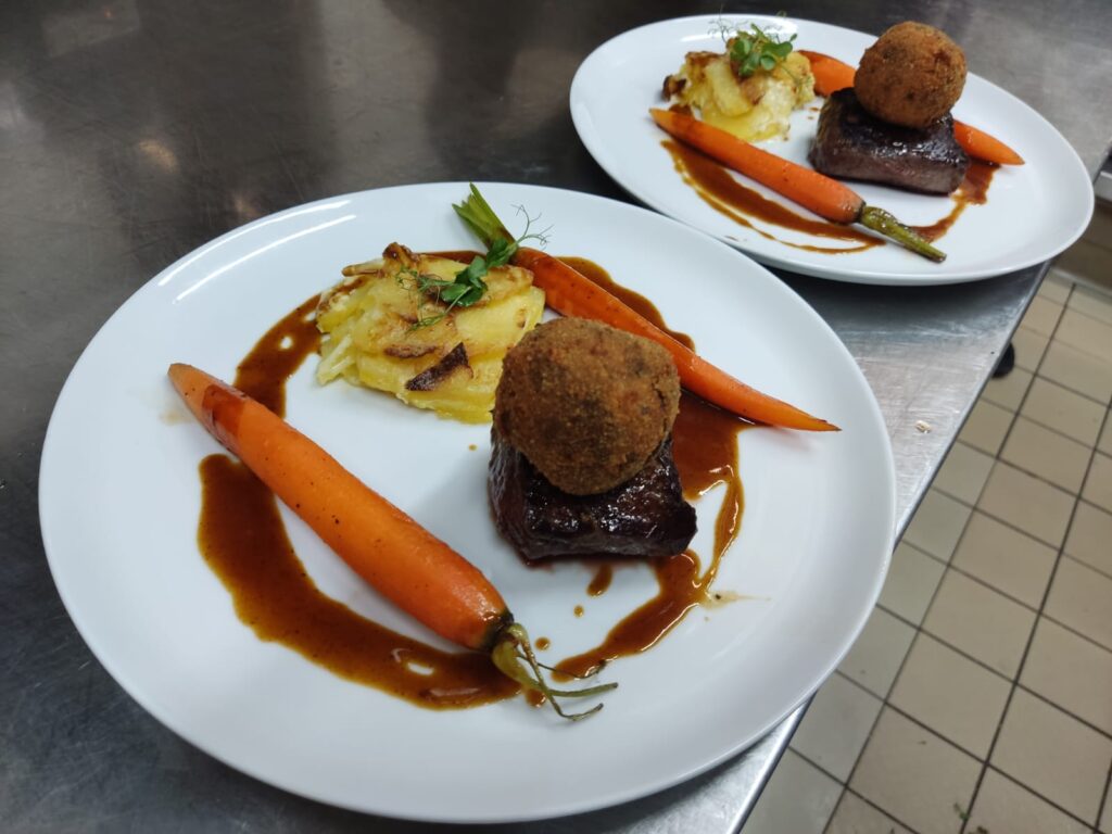 an Schokoladen Rosmarin Jus mit gebratenen Kräuterseitlingen und hausgemachten Kartoffelbällchen